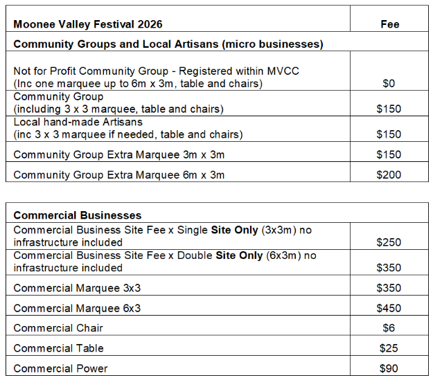 The MVCC Festivals & Events team will be in touch to discuss your submission in detail if it is successful. More information regarding the event program will be provided to applicants as event details are finalised, including final fees and any infrastructure hire costs.